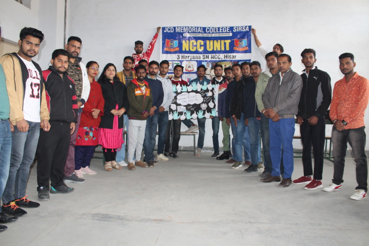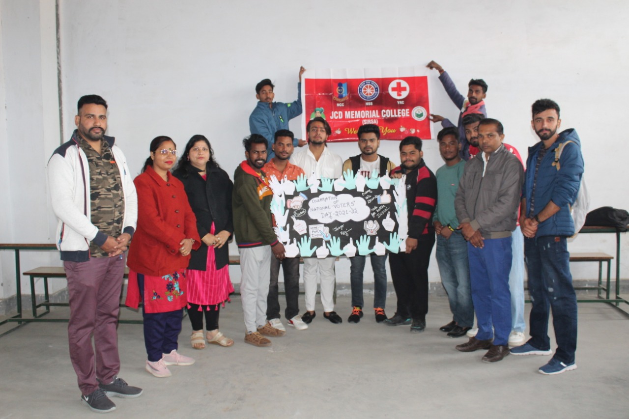 सिरसा, 26 दिसंबर 2021 :जेसीडी विद्यापीठ में स्थित जीसीडी मैमोरियल कॉलेज में सीडीएलयू और जिला निर्वाचन अधिकारी के निर्देशानुसार ‘राष्ट्रीय मतदाता दिवस’ के मौके पर एनसीसी, एनएसएस व वाई आरसी के तत्वाधान में एक विशेष प्रतियोगिता का आयोजन किया गया, इस प्रतियोगिता में 4 तरह की विधाओं को शामिल किया गया।