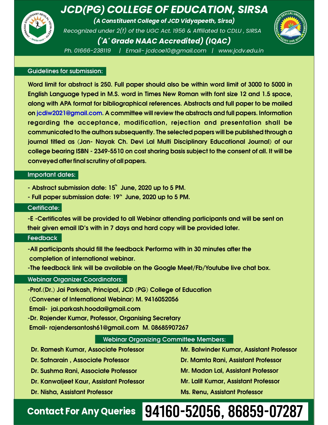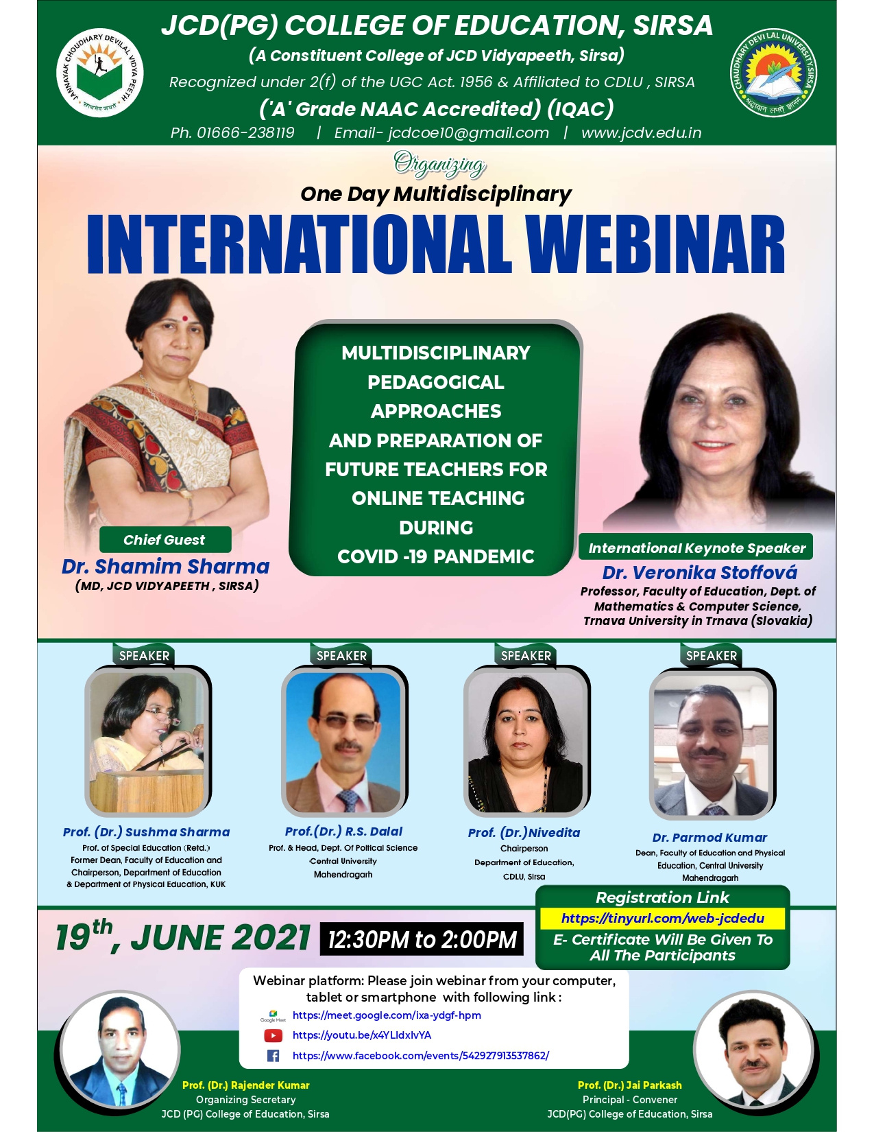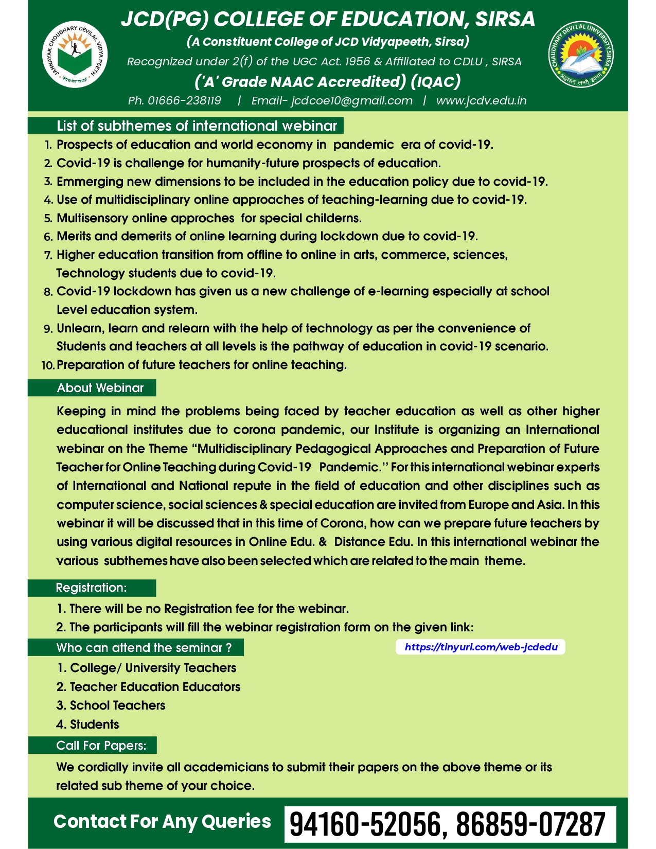 I am pleased to inform you that JCD PG College of Education, Sirsa is organizing a One Day Multidisciplinary International Webinar on the theme